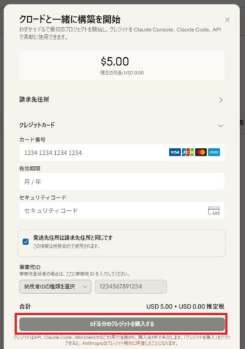 請求先住所を入力し、クレジットカードの番号等を入力し、5ドル分のクレジットを購入しましょう。