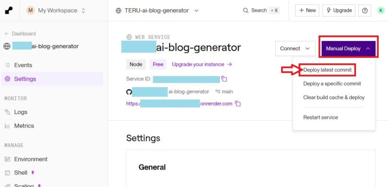 画面上部の右側にある「Manual Deploy」をクリックして一番上の「Deploy latest commit」を選択。