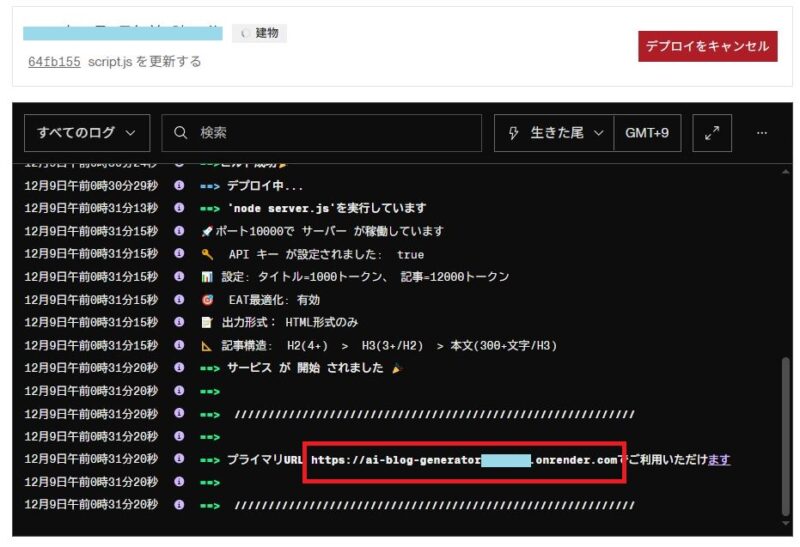 赤囲みをしたところに、URLが表示されるとデプロイの完了です。