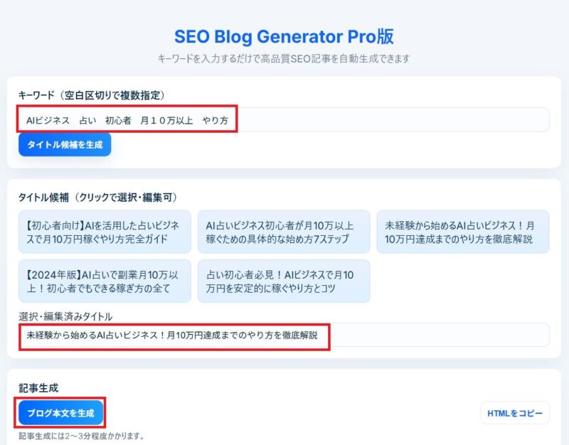 記事が生成されたら、画面の右側にある「HTMLをコピー」のボタンをクリックしてください。
