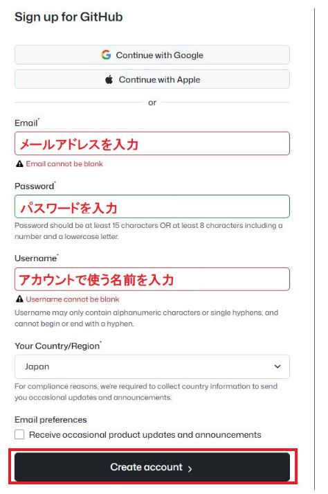 入力が完了したら、一番下にある黒いボタン「Create account」をクリックしてアカウントが作成完了です。
