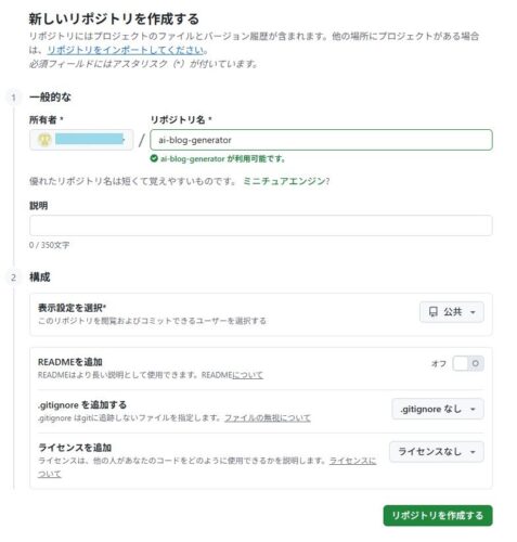 リポジトリ名:「ai-blog-generator」で設定しておきましょう↓