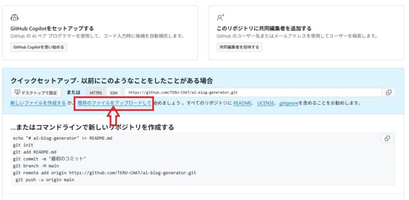 次の画面で、「既存のファイルをアップロードして」という箇所をクリックしてください↓